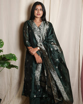 The combination of Royale Green and off-white creates a soothing, feminine ensemble ideal for summer outings, office wear, or casual gatherings. Paired with juttis, the outfit feels both refined and comfortable.