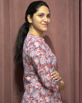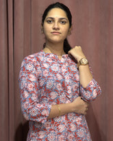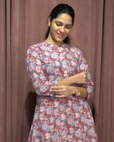 Top: A-line short kurta featuring an all-over floral print in red, blue, and soft pastel tones, offering a youthful and relaxed look