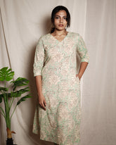 The kurta features an all-over large floral print in calming pastel tones, complemented by matching bottoms for a coordinated, graceful look. Side pockets add functionality, while the side slits ensure ease and comfort throughout the day. Designed without lining to keep it lightweight and airy for warm weather.