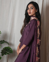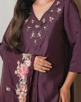 A timeless plum ensemble that exudes understated luxury. The pastel floral embroidery softens the rich colour, making it perfect for festive gatherings, intimate celebrations, and elegant evening wear.