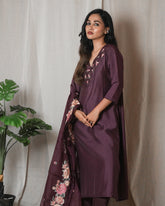 Elevate your festive and occasion wear wardrobe with this rich plum suit set, crafted in a luxurious fabric that brings depth, elegance, and effortless sophistication.