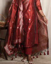 Opulent, graceful, and perfect for festive occasions, weddings, and grand celebrations. This maroon Banarasi silk suit set effortlessly blends tradition with sophistication, making it a statement piece in any wardrobe.