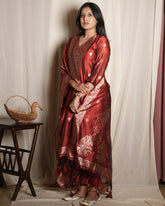 Immerse yourself in timeless luxury with this exquisite maroon Banarasi silk suit set, crafted to bring regal charm and festive elegance to your wardrobe.